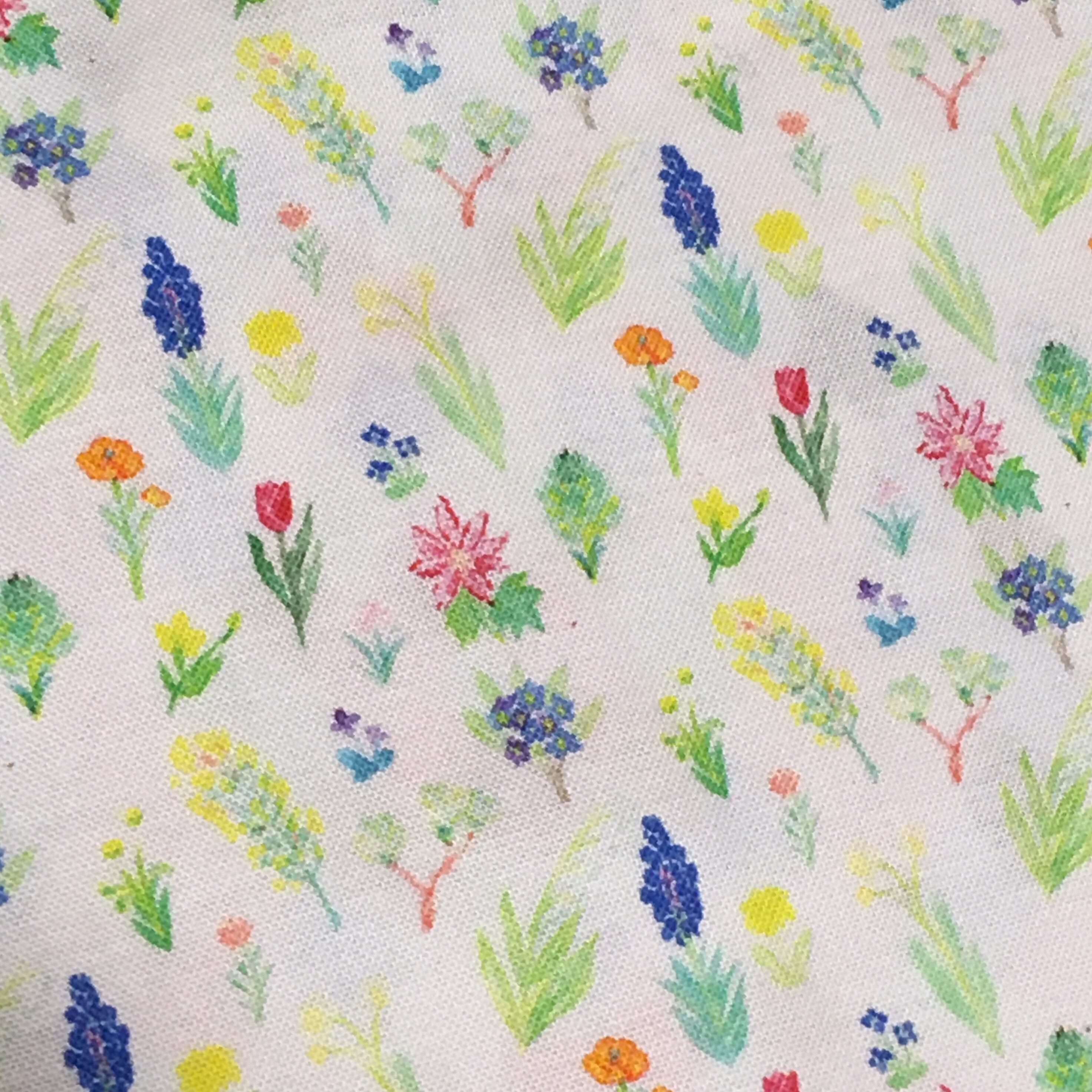 顔彩で描いたイラストをテキスタイルにしています。顔彩ならではのにじみが味わい深いテキスタイルです。小さな春の草花、すずらん、ミモザ、チューリップ、菫などを丁寧に描いたデザインです。