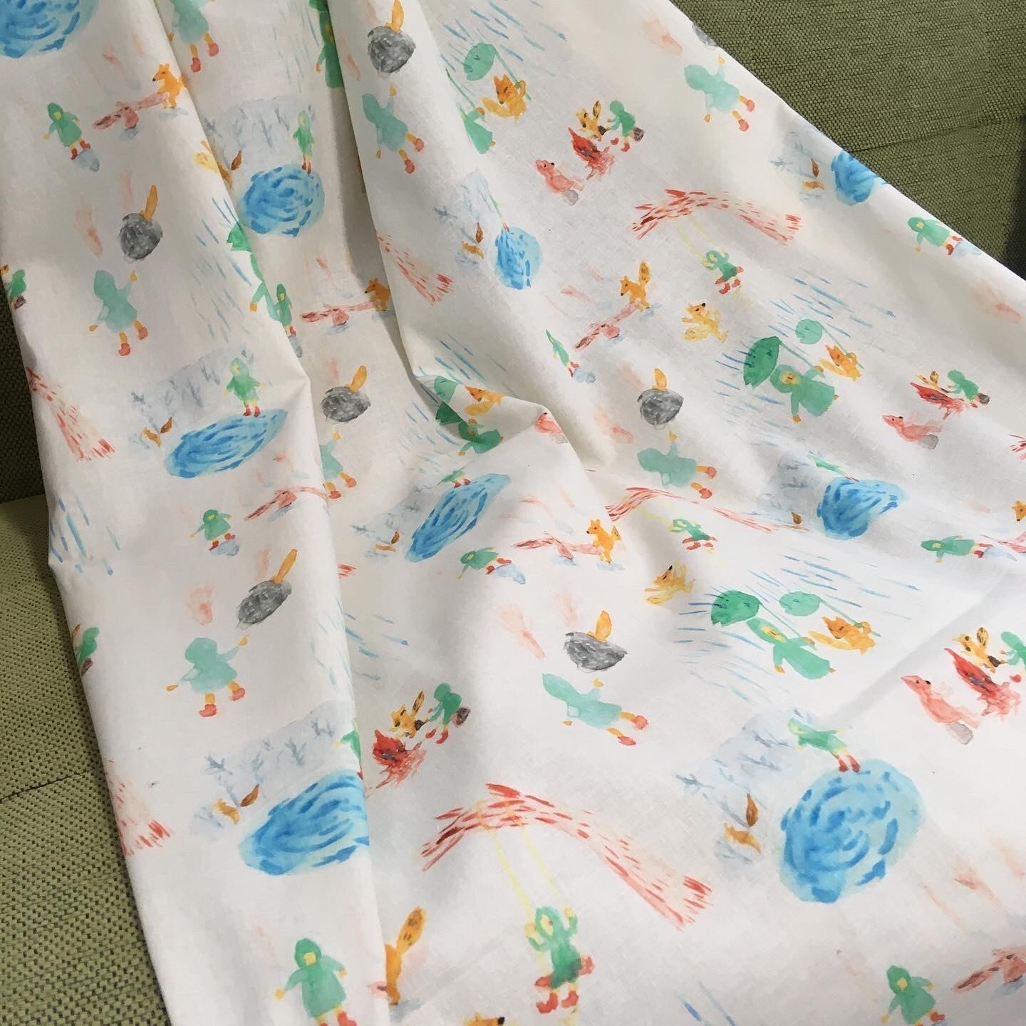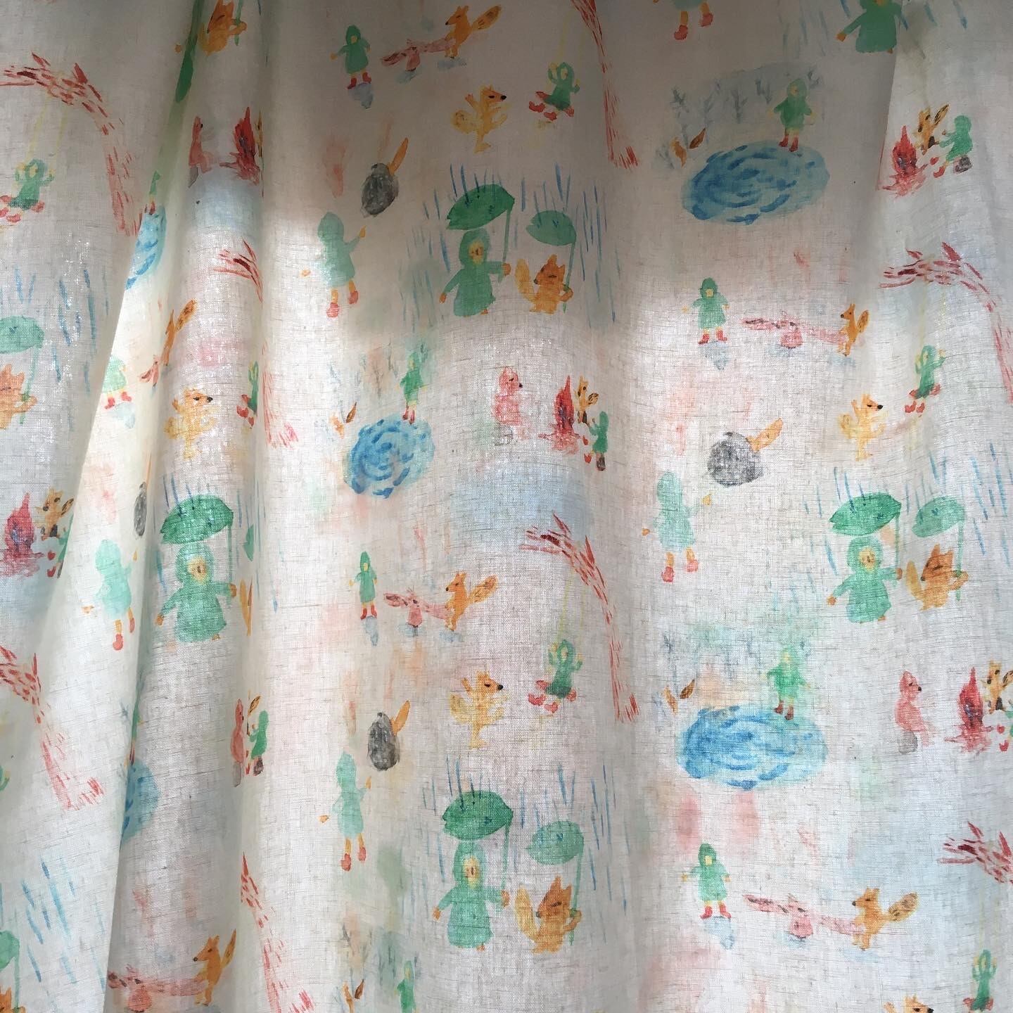 顔彩で描いたイラストをテキスタイルにしています。顔彩ならではのにじみが味わい深いテキスタイルです。雨の中を森でキツネの子やクマの子と一緒に遊んでいるこどもを描いています。