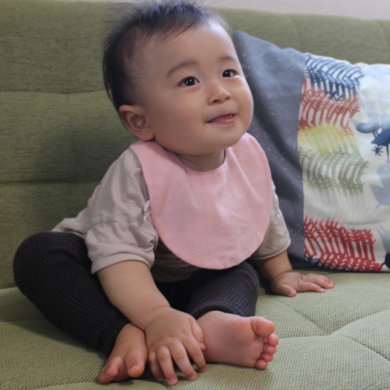顔彩で色とりどりに描いた絵をプリントし、スタイに仕立てました。