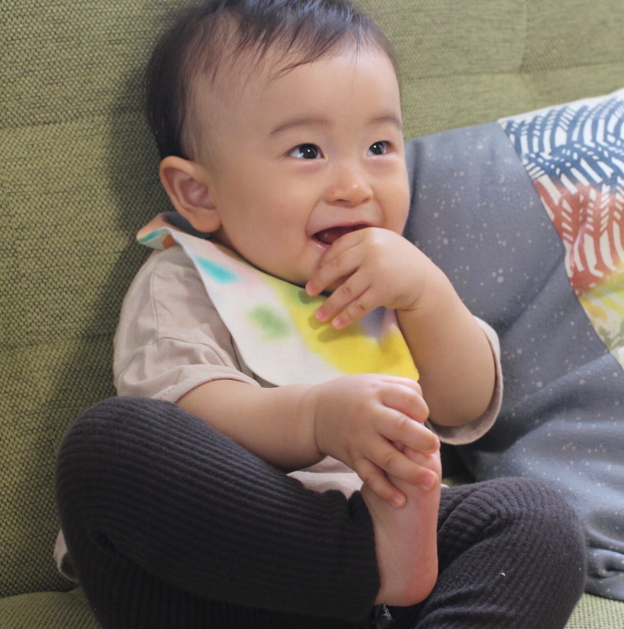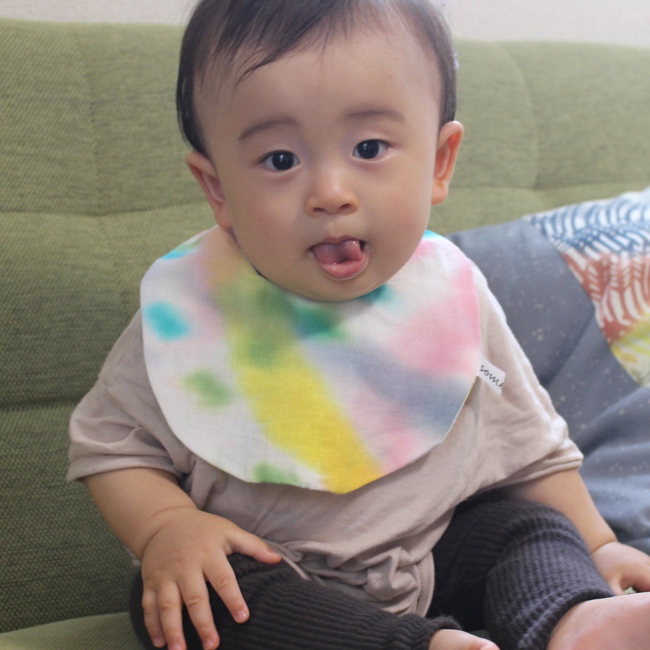 表地は手ぬぐい生地にふんわりとした優しい色合いで染め、裏地は地模様のある薄手のコットンの生地にカラフルなドットの模様を筆で染めています。
