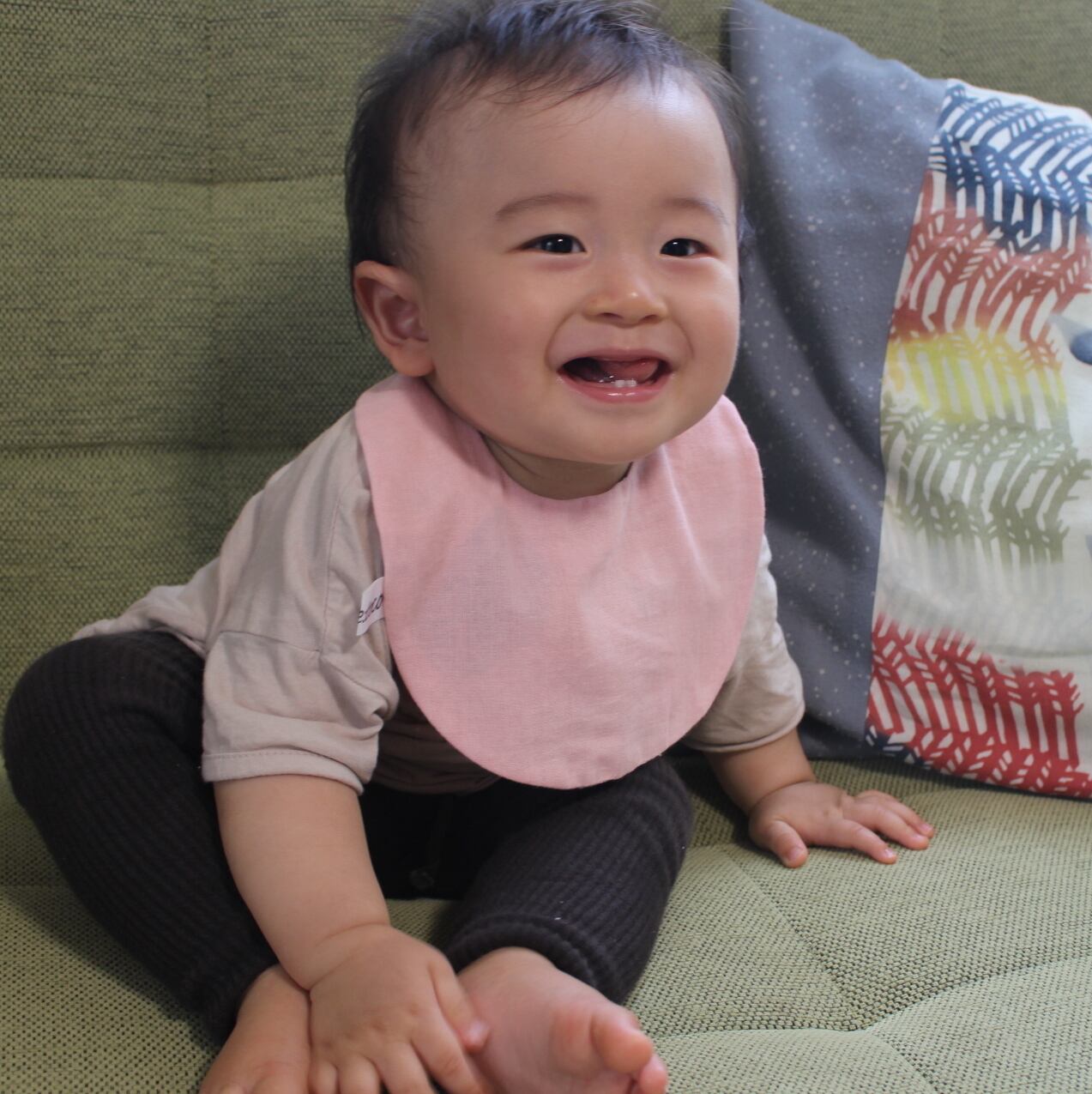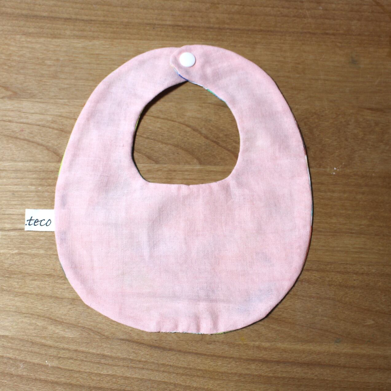 顔彩で色とりどりに描いた蝶々の絵をプリントし、スタイに仕立てました。