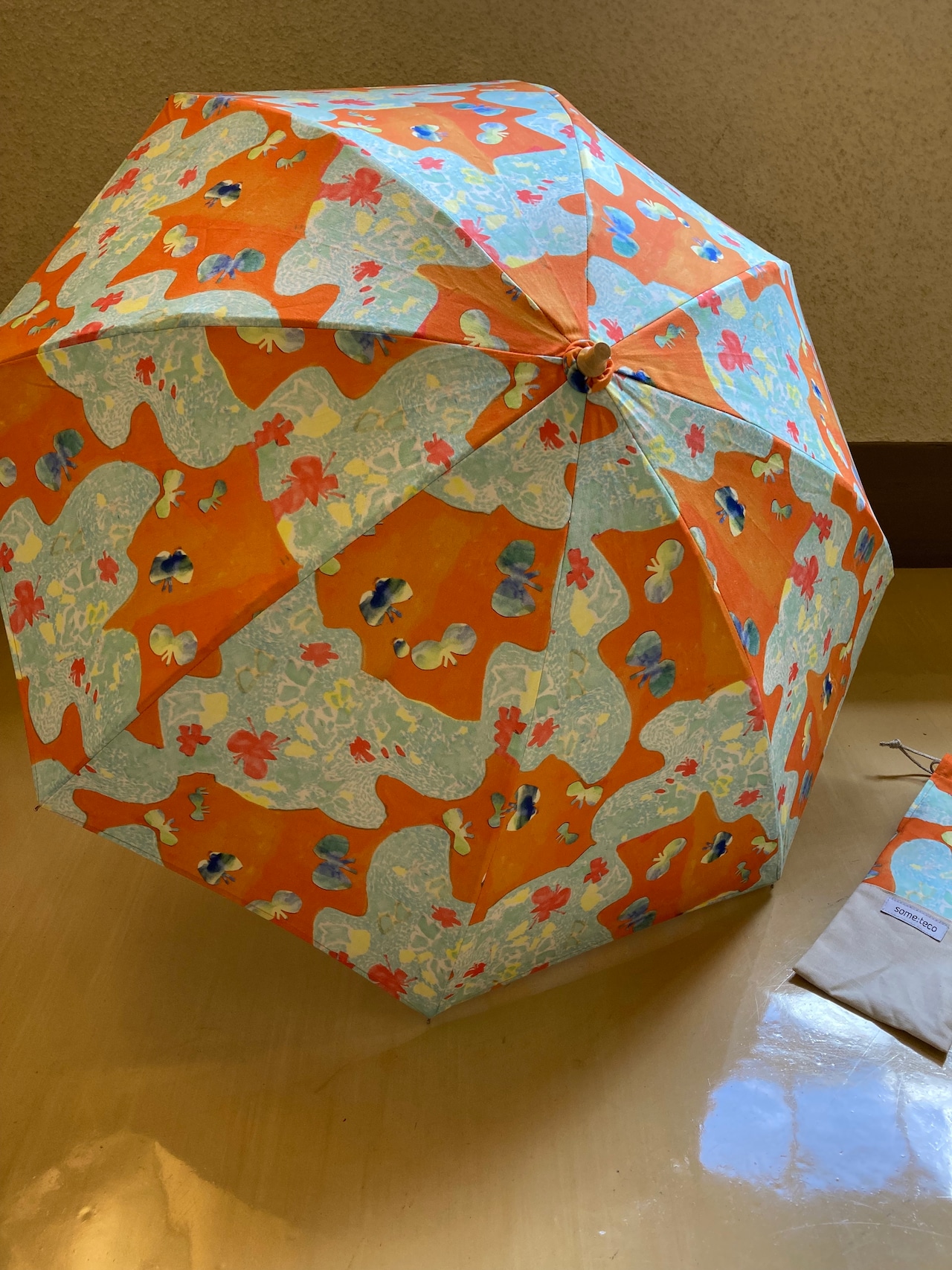 顔彩で描いた「mizutamari」デザインのテキスタイルで折りたたみ日傘を作りました。